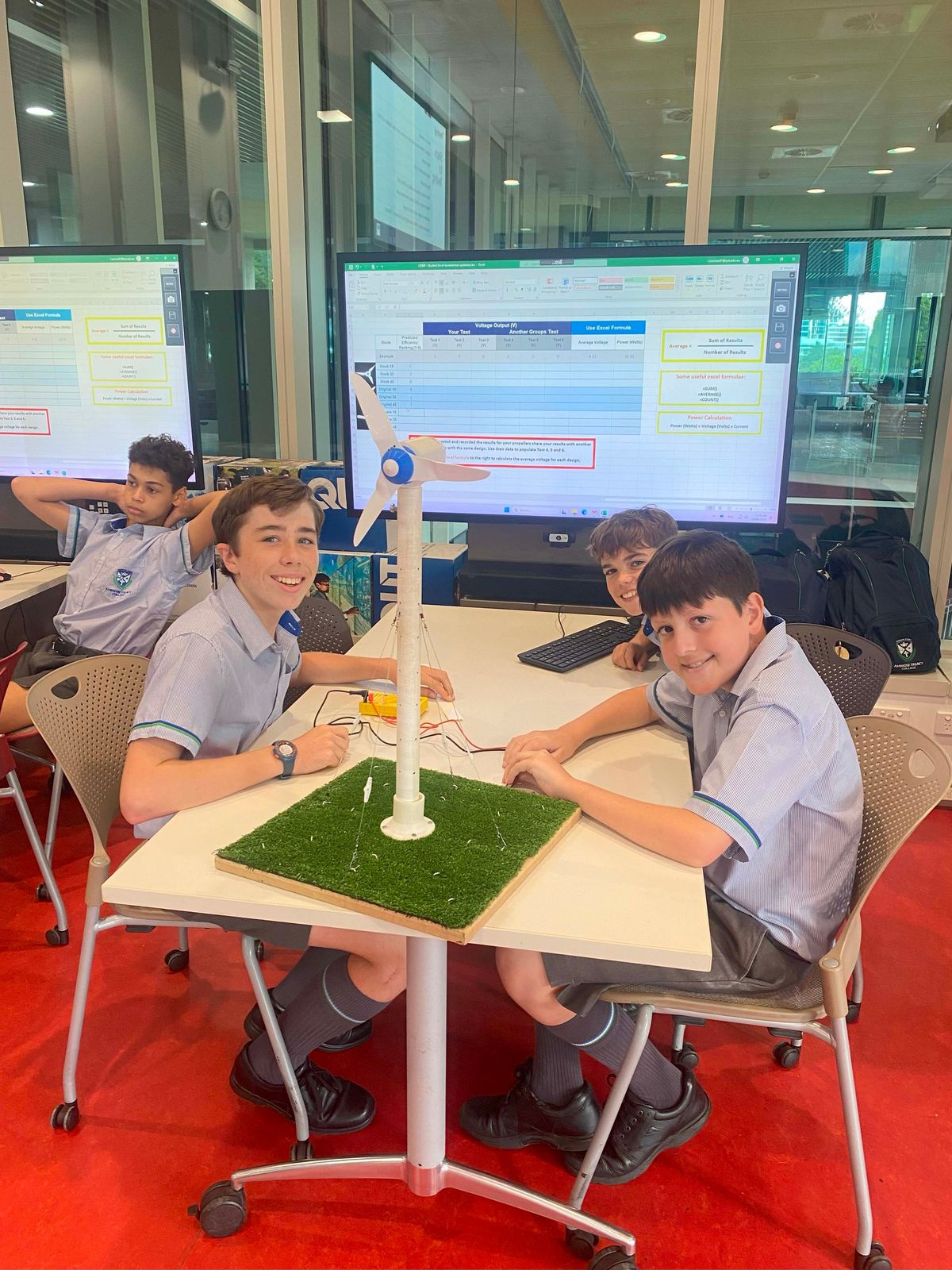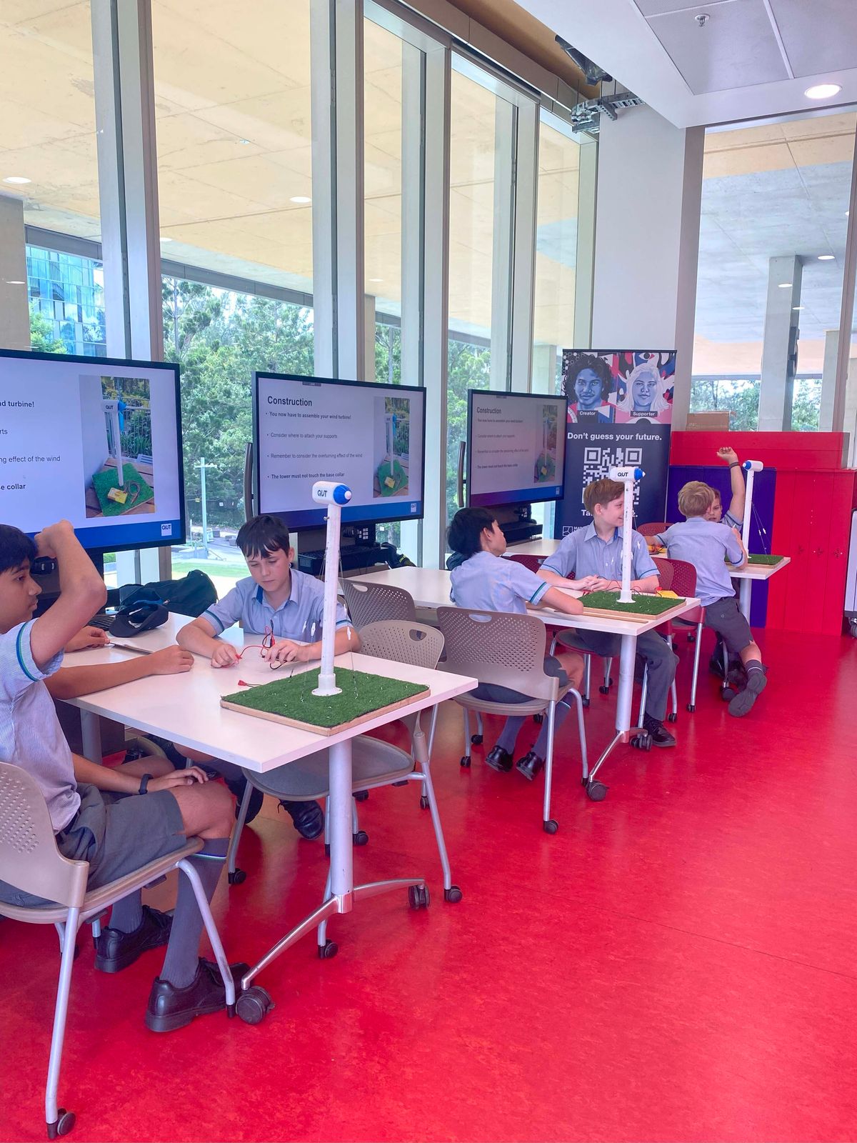 Year 9 students attended QUT’s Wind Power: Clean Energy workshop, predicting, building, and testing wind turbines for efficiency. They then researched a regional town, selecting on of three turbine options and presenting a case considering noise, budget, power output, installation costs, and size to determine the best renewable energy solution.