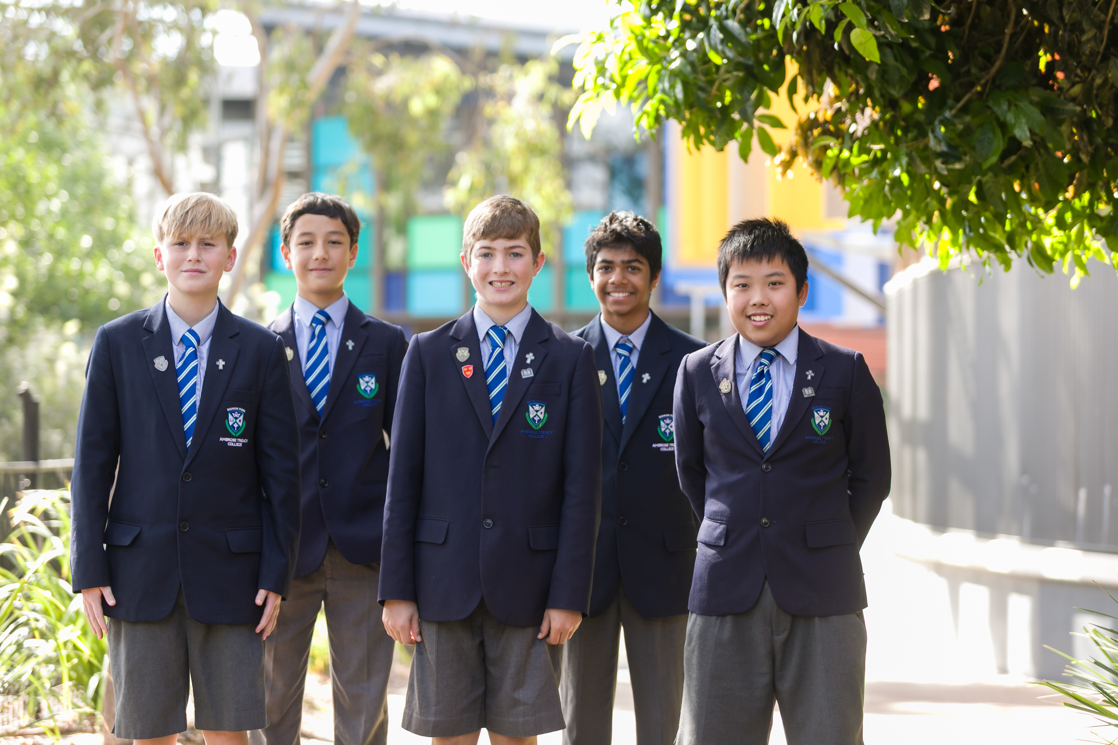 The Ambrose Treacy College Formal Uniform consists of grey shorts or, for Middle and Senior School students, the option of long grey trousers, the College blue and white day shirt, the College navy suit coat, the College tie and long socks. Year 12 students wear the College white shirt as part of their day uniform instead of the pin striped shirt. The Formal uniform is worn from Mothers’ Day to Fathers’ Day each year and on specified occasions.